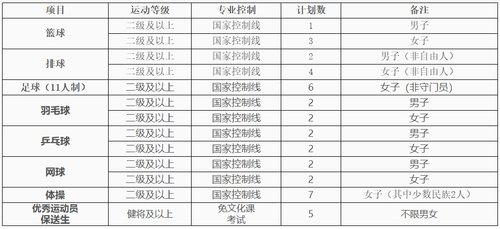 三、招收项目:赛艇2人;乒乓球、羽毛球、网球、足球、篮球、排球、体操共计3人。招生计划使用顺序为:女子乒乓球→男子乒乓球→女子羽毛球→男子羽毛球→女子网球→男子网球→体操→女子足球→女子篮球→男子篮球→女子排球→男子排球。